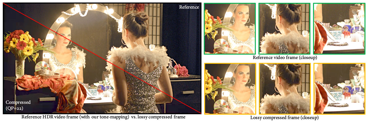 We compare a reference HDR video frame and a lossy compressed frame using our surround-aware CSF model. We compress the original video by three orders of magnitude without perceivable artifacts. Refer to the supplemental video for more results.