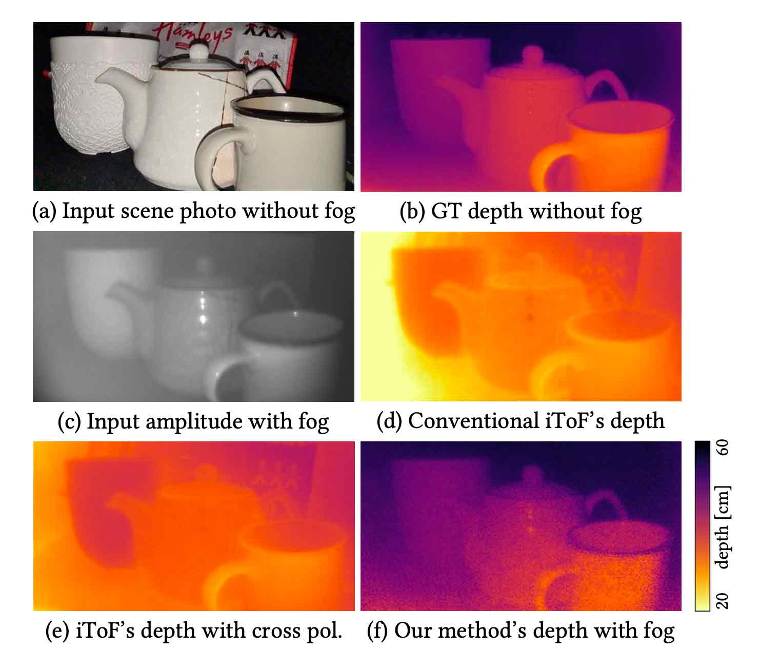 We introduce a polarimetric iToF imaging method that can estimate depth robustly through scattering media. (a) A pho- tograph of the input scene without fog. (b) Ground-truth depth measure without fog. (c) Input iToF amplitude map captured with fog. (d) Depth estimated by a conventional iToF camera with fog. (e) Depth improved by na ̈ıve cross-polarization filtering. (f) Our iToF depth measurement result is fairly close to the GT depth.