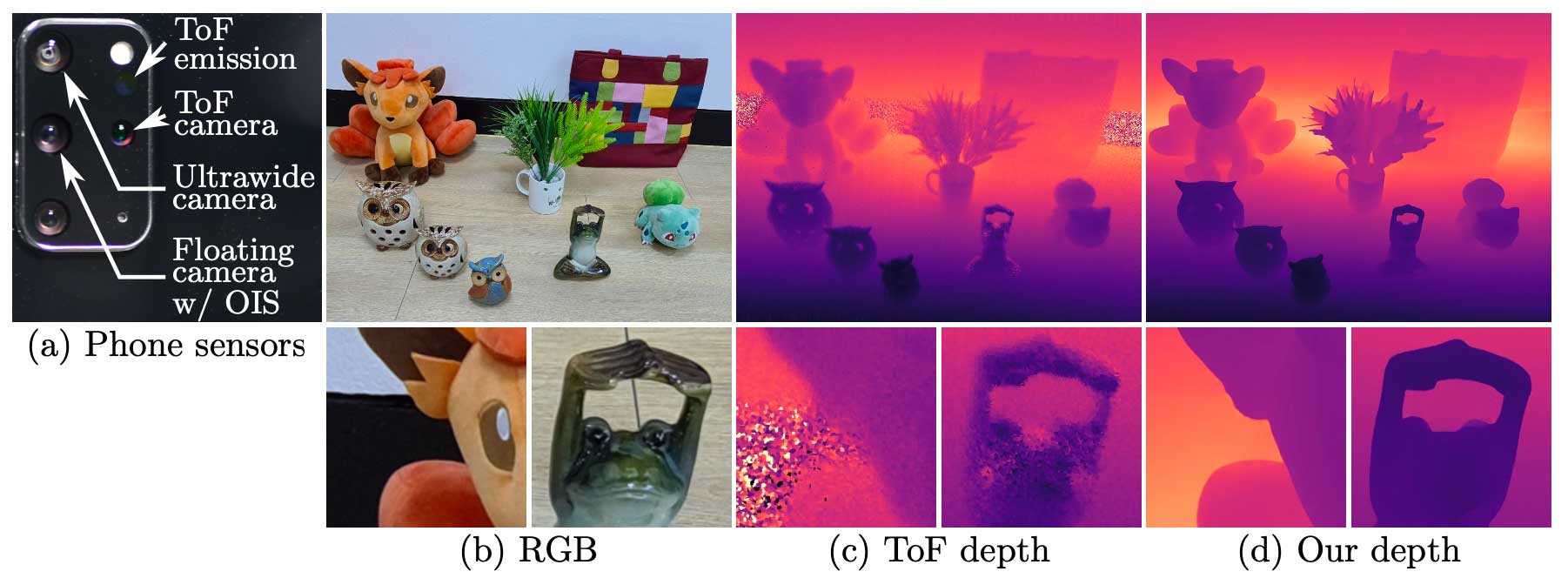 (a) Multi-modal smartphone imaging. (b) Reference RGB image. (c) ToF depth reprojected to the reference. (d) Our depth from floating fusion.