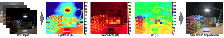 We take an high-dynamic-range image and predict perceptual lightness, colorfulness, and hue attributes. Based on these attributes, we can reproduce the perceptual appearance of the original image on different media, such as a low-dynamic-range display. |