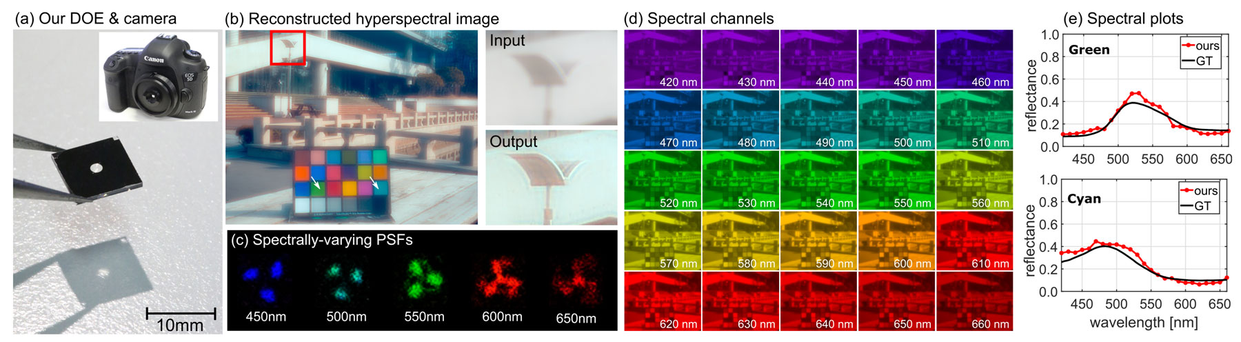 We propose a compact, diffraction-based snapshot hyperspectral imaging method with a novel diffractive optical element attached to a conventional, bare image sensor. Our method replaces the common optical elements in hyperspectral imaging (prism, coded mask, relay and imaging lenses) with a single optical element. Our single DOE-based camera is coupled with a data-driven spectral reconstruction method that can restore faithful spectral information from spectrally-varying point spread functions. (a) Our fabricated DOE (inset) and a DSLR camera, installed with the DOE for spectral imaging. (b) Reconstructed hyperspectral image from real input. (c) Spectrally-varying PSFs measured per wavelength. (d) Corresponding captured spectral channels. (e) Spectral plots of two patches from the captured ColorChecker, compared to the ground truth. |