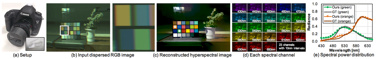 We present a novel, compact single-shot hyperspectral imaging method. It enables capturing hyperspectral images using a conventional DSLR camera equipped with just an ordinary refractive prism in front of the camera lens. Our computational imaging method reconstructs the full spectral information of a scene from dispersion over edges. Our setup requires no coded aperture mask, no slit, and no collimating optics, which are necessary for traditional hyperspectral imaging systems. It is thus very cost-effective, while still highly accurate. We tackle two main problems: First, since we do not rely on collimation, the sensor records a projection of the dispersion information, distorted by perspective. Second, available spectral cues are sparse, present only around object edges. We formulate an image formation model that can predict the perspective projection of dispersion, and a reconstruction method that can estimate the full spectral information of a scene from sparse dispersion information. Our results show that our method compares well with other state-of-the-art hyperspectral imaging systems, both in terms of spectral accuracy and spatial resolution, while being orders of magnitude cheaper than commercial imaging systems. |
