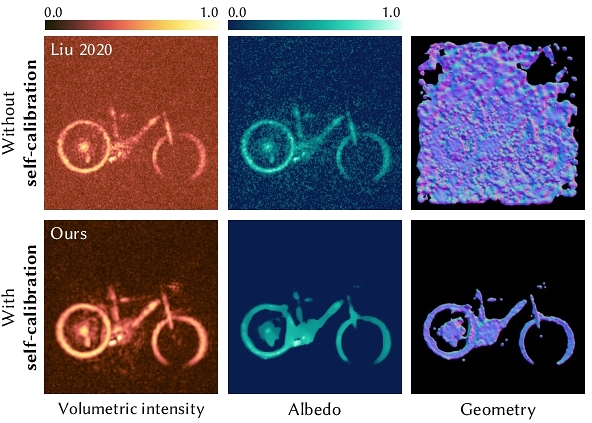 We present a self-calibrating, fully-differentiable NLOS inverse rendering pipeline for the reconstruction of hidden scenes. Our method only requires transient measurements as input and relies on differentiable rendering and implicit surface estimation from NLOS volumetric outputs to obtain the optimal NLOS imaging parameters that yield accurate surface points, normals, and albedo reconstructions of the hidden scene. The top row shows the reconstructed volumetric intensity, albedo, and 3D geometry of a real scene [Liu et al. 2020], failing to reconstruct geometry estimation due to noise interference. The bottom row demonstrates our results after optimization of the imaging parameters. |
