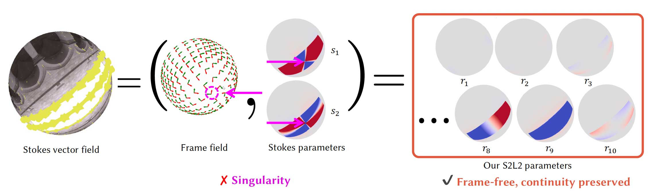 frame-free representation of polarized rays, preserving continuity as actual physical quantities. Such guaranteed properties of our S2L2 representation lead to